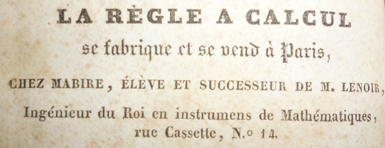 "SLIDE RULE is made and sold in Paris, at Mabire's, Mr Lenoir's apprentice and successor, King's