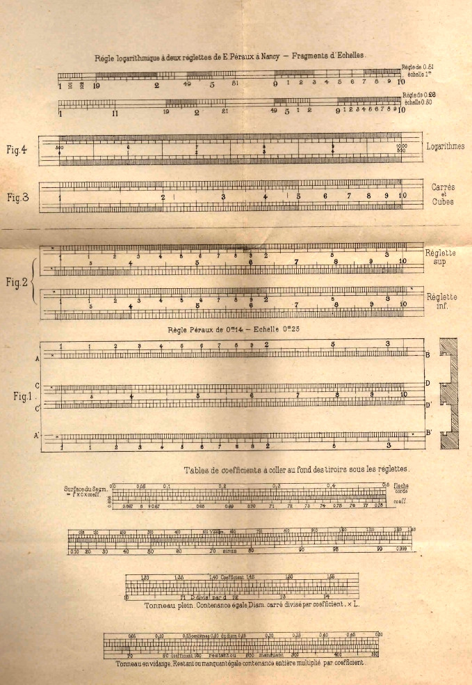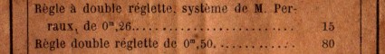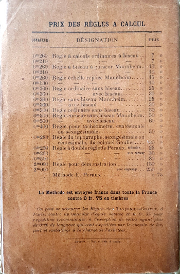 On the back of the book, the price of slide rules in 1893: an ordinary rule (25 cm) is worth 7 francs, the Peraux rule of the same length 15 francs,